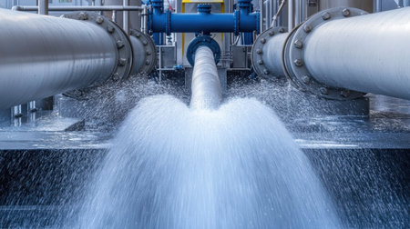 A dynamic view of high-pressure water flowing through metallic pipes, showcasing industrial operations in a modern facility with advanced infrastructure and technology.