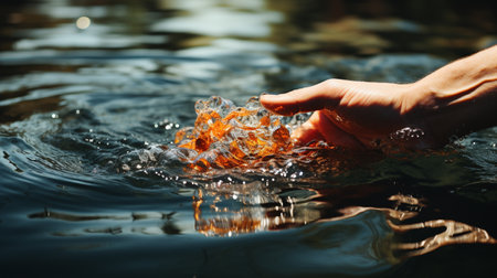 A human hand disturbs the water's surface, with sunlight creating vibrant ripples and patterns.
