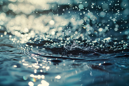 A dynamic image of water droplets splashing in the air with warm sunset light creating a beautiful bokeh effect, capturing motion and energy.