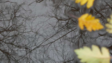 Yellow autumn fallen oak leaves, puddle on grey asphalt. Fall bare leafless tree branches reflection in water. Wet leaf and rain drops close up, waves ripple from raindrop. Gloomy melancholic weather.