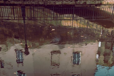 A serene reflection of a building and trees in a puddle on the street. The image has a moody atmosphere. Reality reversed. City street after the rain.