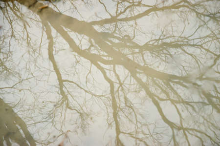 A beautiful scenery of a water surface with the reflection of bare tree branches