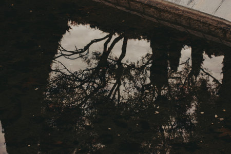 Reflection of trees in calm water. A serene scene captures the reflection of branchy trees in still water, creating a mirror-like effect with dark tones and moody atmosphere. Urban park lake, pond.