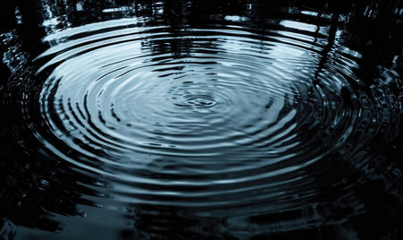 Single drop of water creating perfectly circular ripples expanding on a dark blue water surface, with a subtle light reflection adding depth and tranquility to the scene