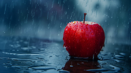 Close-up of a vibrant red apple with water droplets on its surface, set against a dark background with falling rain, highlighting its freshness and juiciness.