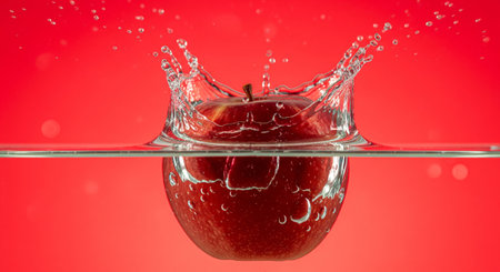 A vibrant red apple splashing into water, with frozen mid-air droplets. The image captures the freshness and vitality of the fruit, symbolizing hydration and health.