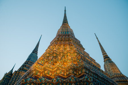 The beautifully decorated pagodas of Wat Pho temple at night. Bangkok, Thailand. Traditional religious architecture of Asia.
