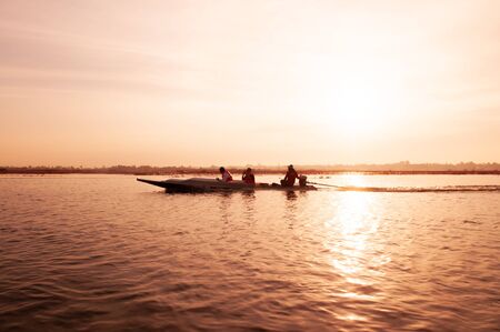 JAN 13, 2019 Udonthani, Thailand - Thai long tail boat with tourist in peaceful Nong Harn lake, Udonthani - Thailand. Wooden boat under warm beautiful sunrise sky over red lotus lake.
