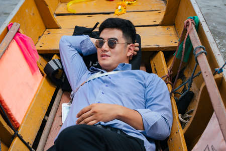 Asian business man wear sunglasses sleep on wooden boat in Bangkok.
