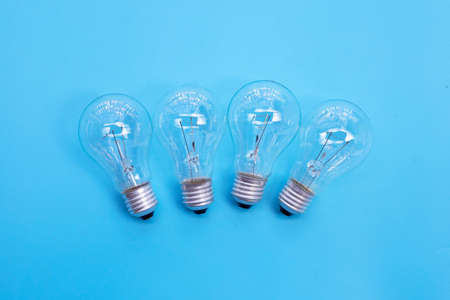Light bulbs on blue background. Ideas and creative thinking concept. Top view