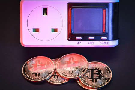 The concept of electricity meter with bitcoins currency as saving electricity costs