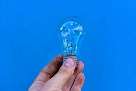Extinguished electric vintage Edison light bulb with a spiral on a blue background. Retro style lamp.