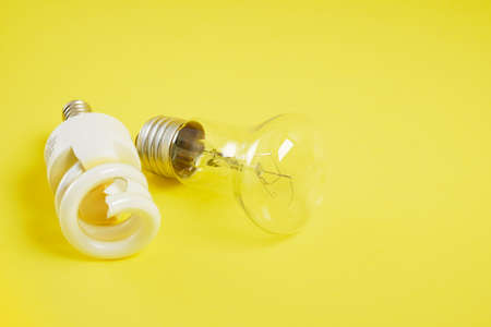 broken screw and incandescent light bulbs on trendy yellow background copy space