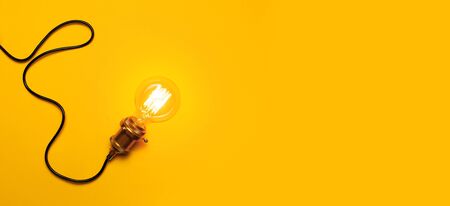 Vintage fashionable edison lamp on bright yellow background. Top view flat lay copy space. Creative idea concept, designer lamp, modern interior item. Lighting, electricity, background with lamp.