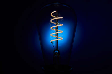 Electric vintage Edison light bulb with a spiral on a blue background. Retro style lamp.