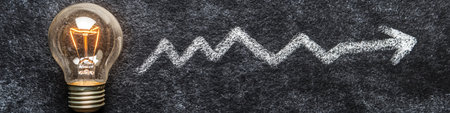 Glowing Light Bulb Next To Rising Arrow On Blackboard, Symbolizing Increasing Energy Costs