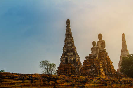Ancient statues and temple on sunset. Wat Chai Wattanaram, Ayutthaya, Thailand