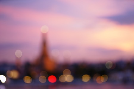 Twilight time of Wat Arun across Chao Phraya River during sunset in Bangkok, Thailand, Defocused blur bokeh background.