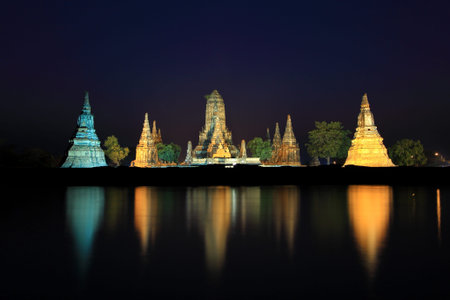 Chaiwatthanaram Temple in Ayutthaya historic park in Thailand at night. Ayutthay historic park is world heritage.