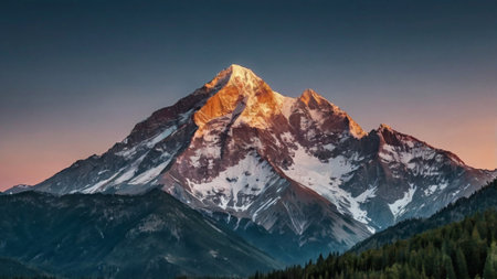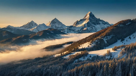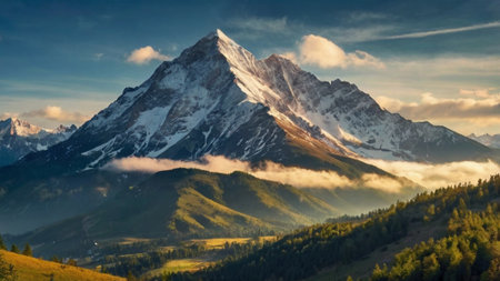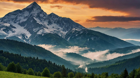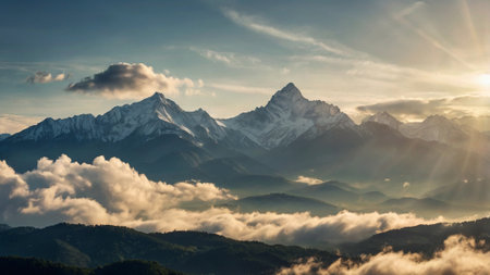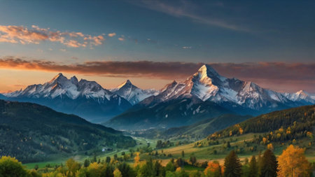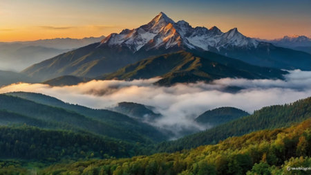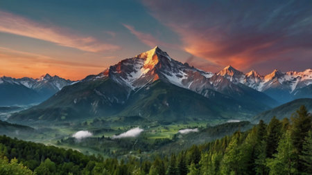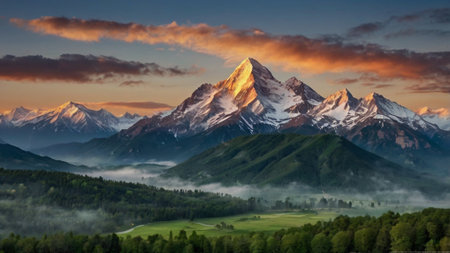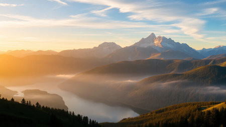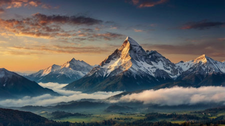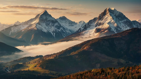 Beautiful mountain landscape with snow-capped peaks at sunrise.