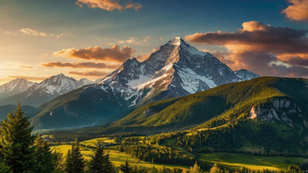 Mountain panorama at sunset. Beautiful alpine landscape with the snow-capped peaks