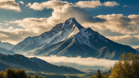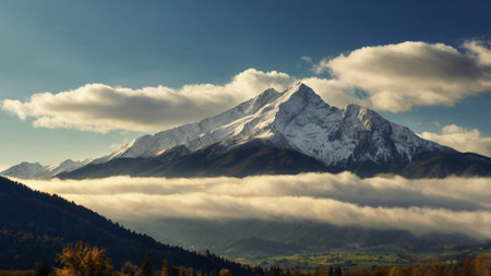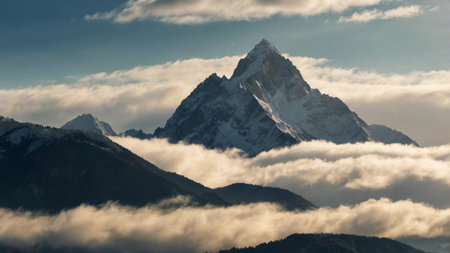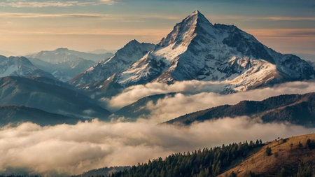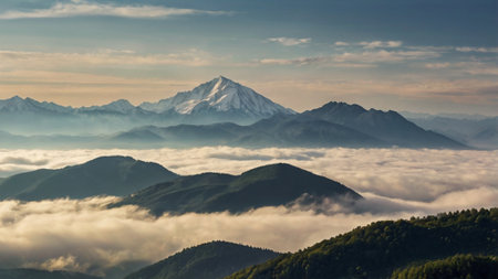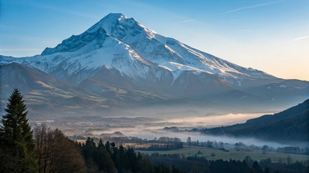 Snow-capped mountain peak above a valley shrouded in morning mist