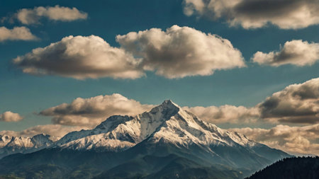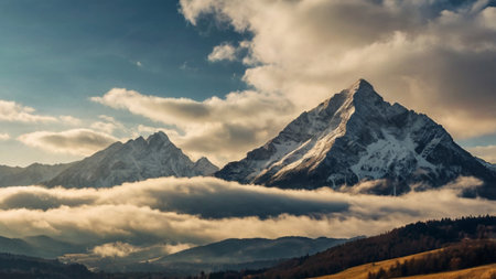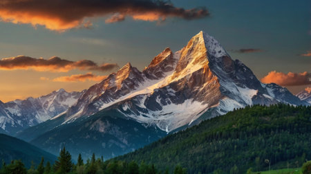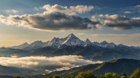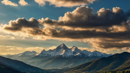 Sunset in the mountains with snow-capped peaks and clouds