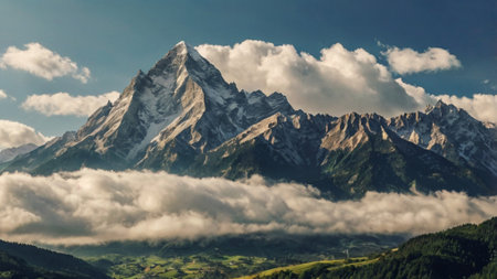 Mountain landscape with snow-capped peaks in the clouds.