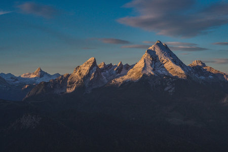 view of mountains Watzmann, Schoenfeldspitze and Hundstod at Berchtesgaden national park at sunrise, Bavaria, Germany