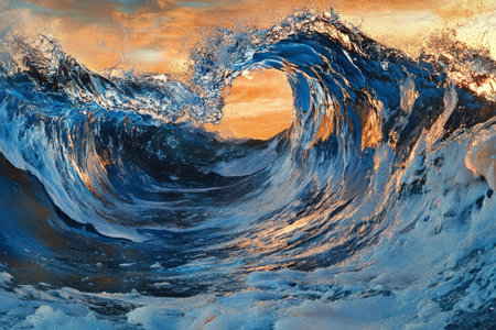 A crystal wave curls and crashes at sunset, reflecting the orange sky and ocean. Clear details and vibrant col...