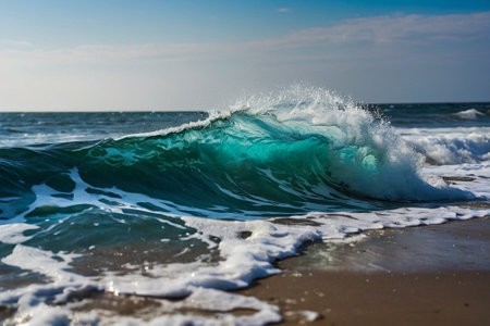 This captivating image showcases foamy waves rolling up the ocean shoreline under a brilliant sky, illustrating natures beauty and the soothing yet dynamic power of the sea as it endlessly meets