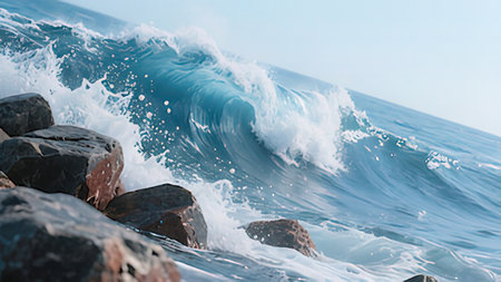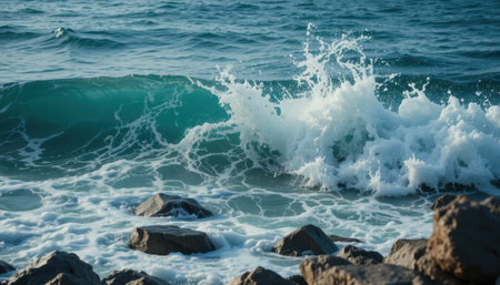 Experience the beauty of turquoise ocean waves crashing against the shore, capturing the dynamic splashes and sunlight reflections.