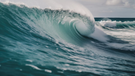 A captivating image of a rolling ocean wave, showcasing the powerful and serene beauty of the sea. The wave's crest is white and foamy, contrasting with the deep blue-green color of the water. The image captures the dynamic motion and energy of the ocean as the wave crashes forward.