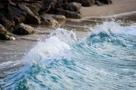 Ocean wave breaking on the beach in the morning. Blue ocean wave.