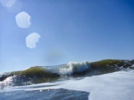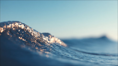 Close-up shot of a small wave cresting, with blurred bubbles in the background against blue sky