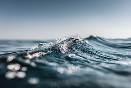A picturesque view of gentle ocean waves illuminated by sunlight, showcasing tranquility and serenity. Ideal for themes related to nature and relaxation.
