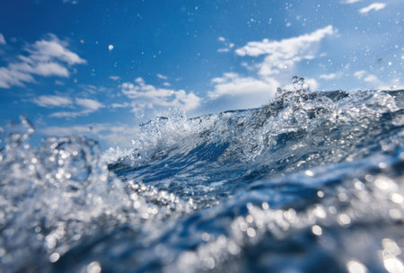 Dynamic ocean wave splashing with crystal-clear water droplets illuminated by natural sunlight.