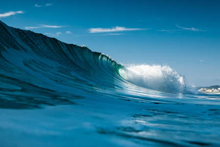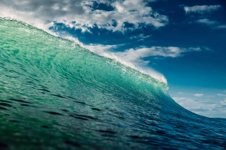 Ocean wave tube inside hollow crashing blue water swimming closeup.