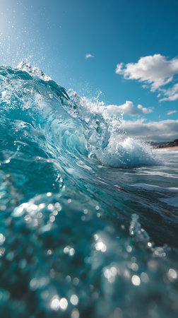 A close-up view of a powerful turquoise ocean wave as it curls and breaks, with sunlight creating reflections on the...
