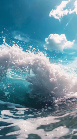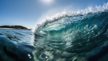 A mesmerizing view of a turquoise ocean wave curling and splashing, capturing the sunlight shimmering through the water and the clear blue sky above with soft clouds.
