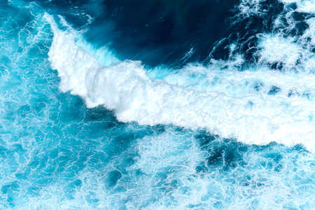 Breaking ocean wave background seen from above, in Bali Indonesia. Marine landscape scene in stormy weather, generating high waves and tides.