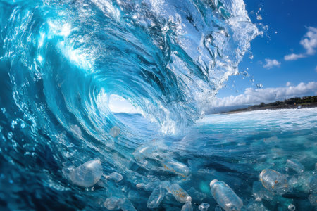 Bright turquoise wave curls dramatically over floating plastic debris, showcasing ocean pollution.