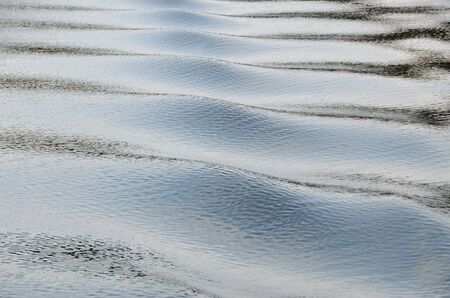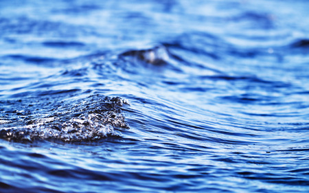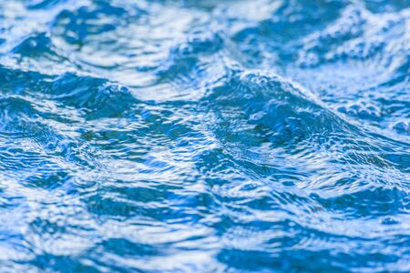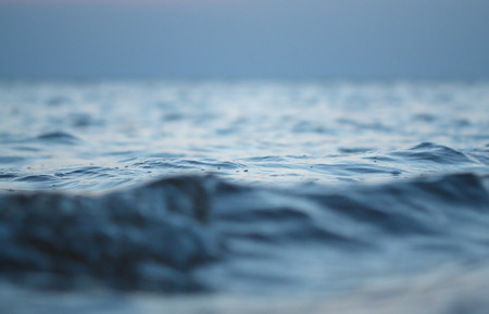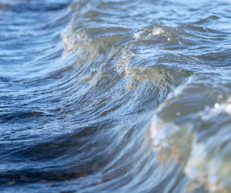 Close-up of water texture, smooth blue waves of water on the shore beach, color landscape photo of water