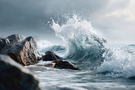 Majestic ocean wave crashing on rocky shore under cloudy sky.