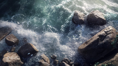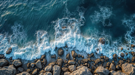 Sea waves on stone beach as wallpaper aerial view on sunset, top view, by ai generative