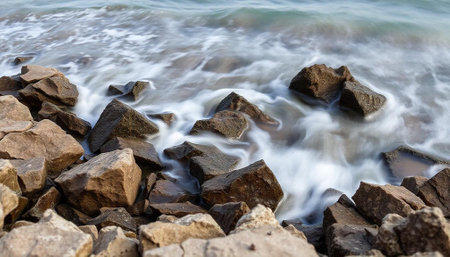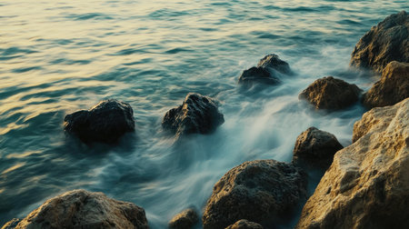 A serene view of soft waves gently lapping against rugged rocks at sunset, capturing the beauty and tranquility of a coastal landscape. Perfect for nature lovers.