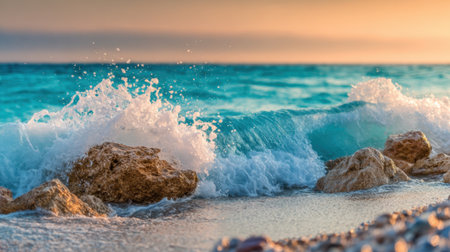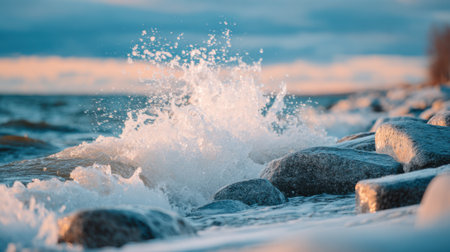 A dynamic close-up shot of a sea wave breaking over stones on the beach. The water creates a beautiful splash, illuminated by the soft light of a sunrise or sunset.