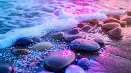 A close-up view of colorful pebbles along a tranquil beach, with gentle waves rolling in. This serene coastal scene captures the beauty of nature and relaxation.