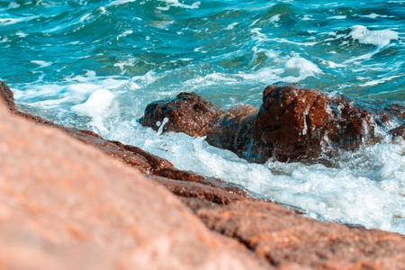 Close-up of sea waves breaking on the rocks of Vilanova y la Geltru beach