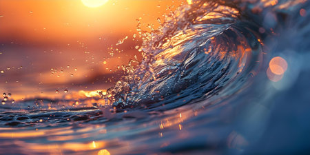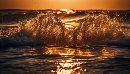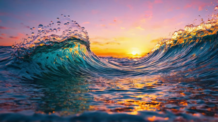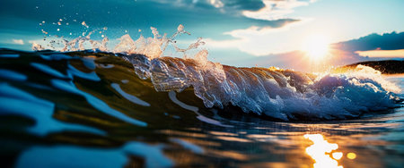 A powerful ocean wave crests and breaks, illuminated by the warm glow of a golden sunset, creating a dynamic splash of water and foam.